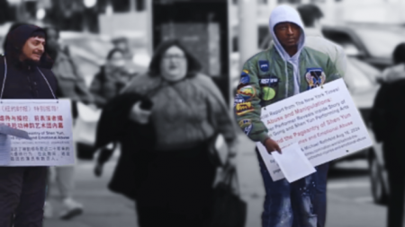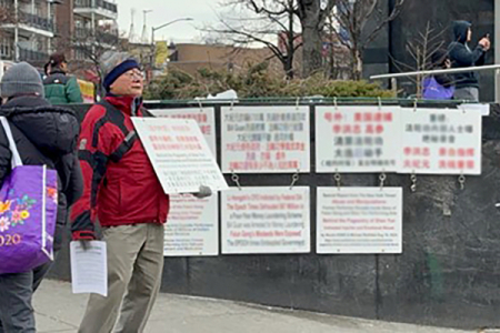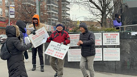 Vào tháng 02/2025, tại Flushing, một học viên Pháp Luân Công nhiều lần chất vấn một người đàn ông Trung Quốc (mặc áo khoác màu vàng nhạt) đang cầm bảng và phát tờ rơi. Tấm bảng đó cũng lặp lại các luận điệu từ nhiều bài báo sai sự thật trên tờ The New York Times nhằm vào Pháp Luân CôngShen Yun.