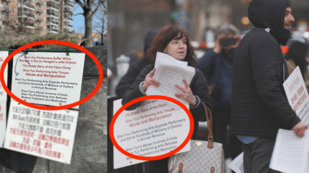 Phóng viên báo The Epoch Times phát hiện rằng các khẩu hiệu và tờ rơi công kích Shen Yun mà những người quấy rối sử dụng giống hệt với những biểu ngữ và tài liệu được sử dụng bởi “những người được thuê” ở Flushing, New York hồi tháng 02/2025, tất cả đều in lại nội dung từ bài viết đầu tiên của tờ The New York Times công kích Shen Yun.