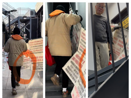 Ngày 02/02/2025, Chu Lập Sáng bị quay phim khi treo các bảng trưng bày công kích Pháp Luân CôngShen Yun tại Flushing, đồng thời phát tán các bài viết sai sự thật về Shen Yun của The New York Times. (Ảnh: The Epoch Times)