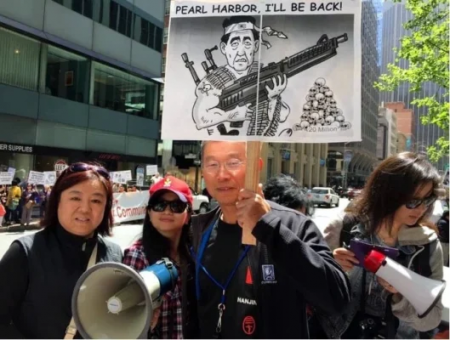 Vào ngày 28/04/2015, khi còn là Phó Chủ tịch của Hội thúc đẩy Thống nhất Hòa bình Trung Quốc, Chu Lập Sáng (giữa) đã tham gia biểu tình chống Nhật tại New York, khi đó Nhật Bản và Mỹ đang tiến hành hội đàm ngoại giao cấp cao. (Ảnh: Trang Facebook của Hội người Hoa thung lũng Silicon/Boston Online)