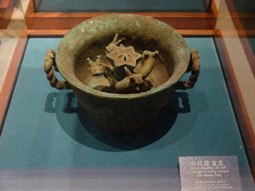 Chân đế bằng đồng có hoa văn rồng thời Xuân Thu của nước Sở, được khai quật tại huyện Tích Xuyên, tỉnh Hà Nam, hiện được lưu giữ tại Bảo tàng Hà Nam.