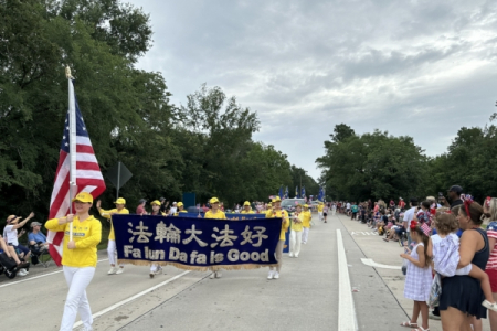 Ngày 04/07/2025, trong cuộc diễu hành mừng Ngày Độc lập Hoa Kỳ tổ chức tại thành phố Woodlands, phía bắc Houston, Texas, đoàn Pháp Luân Công đã giương cao biểu ngữ “Pháp Luân Đại Pháp Hảo”. (Ảnh: Ngô Hương Liên/The Epoch Times)