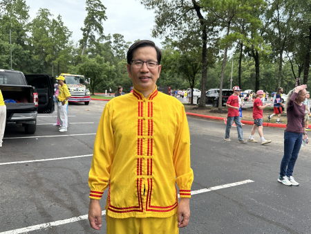 Ngày 04/07/2025, trong cuộc diễu hành mừng Ngày Độc lập tại thành phố Woodlands, phía bắc Houston, tiểu bang Texas, điều phối viên của Hiệp hội Pháp Luân Đại Pháp miền Nam Hoa Kỳ, ông Sean Yang đã tham gia diễu hành và tiếp nhận phỏng vấn. (Ảnh: Ngô Hương Liên/The Epoch Times)