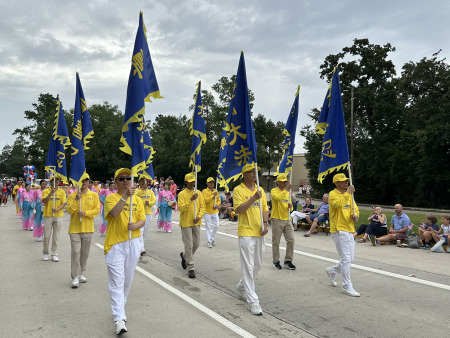 Ngày 04/07/2025, trong cuộc diễu hành mừng Ngày Độc lập Hoa Kỳ tổ chức tại thành phố Woodlands, phía bắc Houston, tiểu bang Texas, đội cờ của nhóm Pháp Luân Công đã tham gia biểu diễn. (Ảnh: Ngô Hương Liên/The Epoch Times)