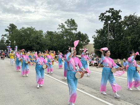 Ngày 04/07/2025, trong cuộc diễu hành mừng Ngày Độc lập Hoa Kỳ tại thành phố Woodlands, phía bắc Houston, tiểu bang Texas, đội trống lưng của nhóm Pháp Luân Công đã tham gia biểu diễn. (Ảnh: Ngô Hương Liên/The Epoch Times)