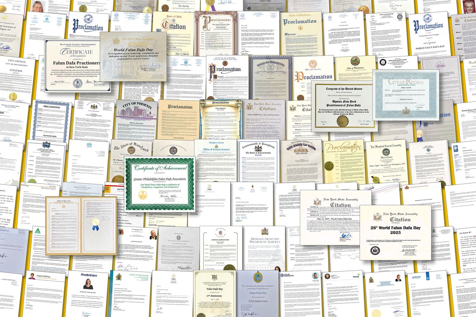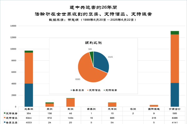 Trong suốt 26 năm bị Đảng Cộng sản Trung Quốc (ĐCSTQ) bức hại, Pháp Luân Công đã nhận được khoảng 13.000 thư khen ngợi, thư ủng hộ và nghị quyết từ khắp nơi trên thế giới. (Theo Minh Huệ Net)