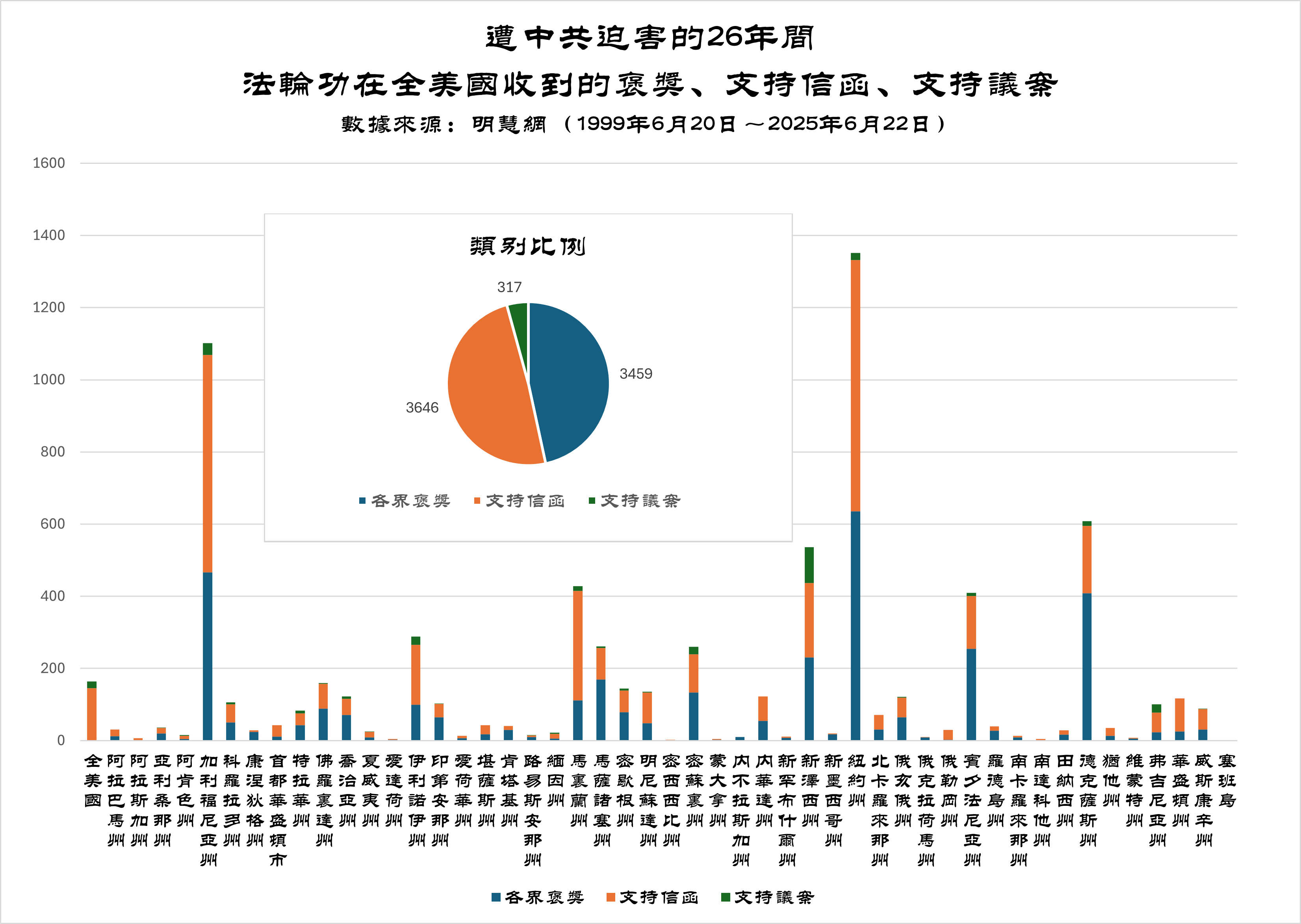 Trong đó, Pháp Luân Công đã nhận được hơn 7.400 thư khen ngợi, nghị quyết ủng hộ, v.v. từ các tiểu bang và chính quyền liên bang tại Hoa Kỳ, chiếm khoảng 57% trên tổng số.