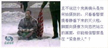 Chưa cần nói đến việc ống kính hoàn hảo đó được ghi hình như thế nào, chỉ cần nhìn vào hình ảnh cảnh sát cầm chăn chữa cháy thả lỏng trong tay, ung dung đứng đối diện ống kính máy quay, chân hướng về phía máy quay, bạn có thể tin rằng cảnh sát đang “khẩn cấp cứu người” không?