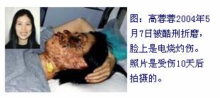 Học viên Cao Dung Dung bị tra tấn dã man vào ngày 07 tháng 05 năm 2004, trên mặt có vết bỏng do điện gây ra. Bức ảnh được chụp sau khi bị thương 10 ngày.