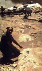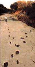 Vào mùa khô năm 1999, người ta đã chụp lại được hình ảnh dấu chân người và dấu chân khủng long ba ngón đan xen rõ ràng trên lòng sông. Trong bức ảnh, các dấu chân dẫn đến chỗ người đứng là của con người, còn các dấu chân hướng về bên phải thì thuộc về khủng long ba ngón. (Nguồn ảnh: Dr. Don Patton)