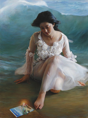 Giáo sư Trương nói: Bức tranh “Ta là ai” này về phương diện ngôn ngữ tình tiết sử dụng vô cùng khéo léo. Trước mặt nhân vật nữ đặt một cuốn sách có tựa đề “Câu chuyện chân thực về luân hồi chuyển thế”, trên bìa sách có một đóa hoa sen, và trên hoa sen viết dòng chữ “Pháp Luân Đại Pháp hảo”. Khi nhìn vào cô gái này, khi bạn tiếp tục nhìn vào y phục mà cô ấy mặc, nhìn vào màu da của cô, có thể thấy cô có một cuộc sống lãng mạn. Nhưng sau khi cô đọc cuốn sách “Câu chuyện chân thực về luân hồi chuyển thế” này, cô bắt đầu suy ngẫm về ý nghĩa của đời người là gì, trong quá trình suy tư, đóa sen liền phát quang, chiếu sáng, cô hiểu ra đâu mới là ánh sáng của sinh mệnh. Cô đã nhìn thấy ánh sáng rồi, và hiểu được làm thế nào để sống một cuộc đời này – chính là tu Chính Pháp.