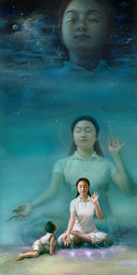 Dùng hội họa để biểu đạt so với việc dùng ngôn ngữ con người thì trực quan hơn, cũng chân thực hơn. Bức “Mẹ trong mắt em” này đã thể hiện trạng thái ‘Thân Thần nhất thể’ của người tu luyện Chính Pháp tại không gian bề mặt và ở không gian khác, đây là điều rất hiếm thấy. Tác phẩm “Mẹ trong mắt em” này đã thể hiện ra một cách rất chân thực những thứ mà thiên mục của đứa trẻ nhìn thấy được. Cách xử lý khung cảnh cũng rất tốt, cách biểu hiện ý cảnh như vậy xưa nay chưa từng có, hội họa Trung Quốc không có, hội họa phương Tây cũng không có, nó đặc biệt đến như vậy. Tại sao lại như vậy? Bởi bức tranh này đã biểu hiện một phương diện đặc biệt của người tu luyện Chính Pháp. Bức tranh này phù hợp với nguyên lý Chân – Thiện – Nhẫn, “Chân” là chỉ chân thực thật sự, rất thiện lương, rất đẹp, rất quang minh, người ta sau khi xem tranh sẽ được khải thị, tấm lòng trở nên rộng mở, hơn nữa khiến cho người ta có một cảm giác thoải mái đặc biệt, cảm thấy quang minh. Khi người mẹ đả tọa, cô như đang ở trong tiên cảnh, đợi khi bạn nhìn vào cũng sẽ đưa bạn vào trong tiên cảnh đó. Bạn nhìn đóa hoa sen khi người mẹ đả tọa kia xem, hương vị của tiên cảnh đó có thể cảm giác ra được. Bạn nhìn thấy chỉ là một tình tiết nhỏ bé nhưng ý cảnh mà nó biểu hiện lại không hề nhỏ. Bạn sẽ cảm thụ được năng lượng chính diện. Từ trong đó sẽ thể ngộ được rất nhiều cảm thụ có ích.