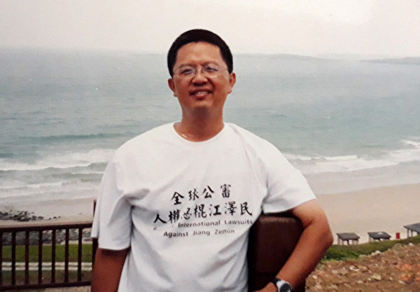 Ông Dư Trí Vinh mặc áo phông có dòng chữ “Toàn cầu xét xử tội phạm nhân quyền Giang Trạch Dân” tham gia một sự kiện tại Vịnh Tây Tử để khởi kiện Giang. (NXB Bác Đại cung cấp)