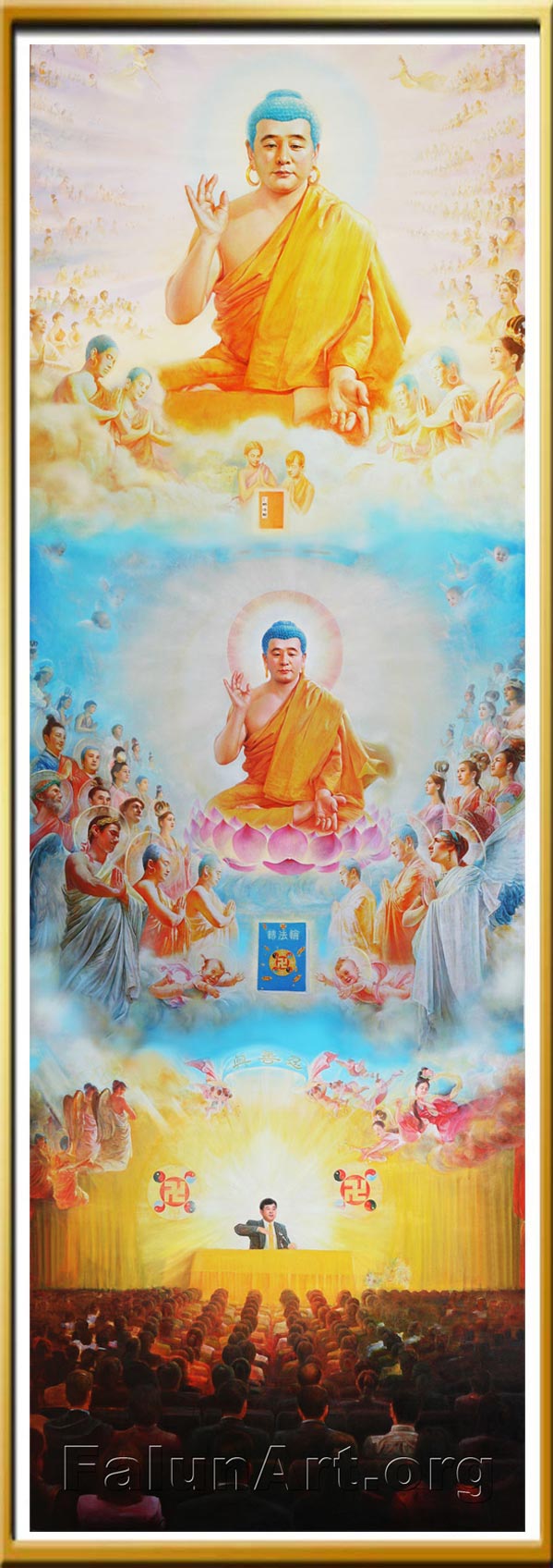 Thuận theo sự an bài lâu dài trong lịch sử cho đến nay, Pháp Luân Đại Pháp đã lặng lẽ khai truyền tại thế gian vào năm 1992. Bức tranh này được họa sĩ Trương Côn Luân phác họa, sau đó được họa sĩ Lý Nguyên và Trần Tiếu Bình vẽ.