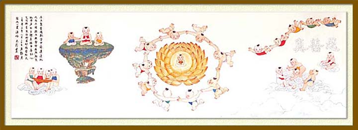 Người mẹ trẻ trong bức tranh đang may biểu ngữ “Pháp Luân Đại Pháp hảo” bằng tiếng Trung và tiếng Anh. Đứa bé nằm bên cạnh cô tượng trưng cho hy vọng. Ở Trung Quốc đại lục, nếu các học viên Pháp Luân Công treo biểu ngữ mang dòng chữ “Pháp Luân Đại Pháp Hảo” thì sẽ bị chính quyền ĐCSTQ giam giữ phi pháp, phán quyết. Thế nhưng, trong năm năm qua (từ năm 1999-2004), các học viên Pháp Luân Công với trái tim đại từ đại bi đã giương cao biểu ngữ “Pháp Luân Đại Pháp Hảo” khắp các phố lớn, hẻm nhỏ, khiến tà ác khiếp sợ.