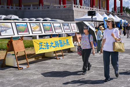 Ngày 18/10/2025, hơn 5.000 học viên Pháp Luân Công đến từ Đài Loan, Mỹ, Canada, Nhật Bản, Hàn Quốc, Hồng Kông và các nơi khác, đã tổ chức hoạt động xếp chữ tại Quảng trường Tự Do thuộc Tưởng niệm Đường Trung Chính ở Đài Bắc. Hình ảnh người dân xem tấm bảng chân tướng về Pháp Luân Công. (Ảnh: Tống Bích Long/The Epoch Times)