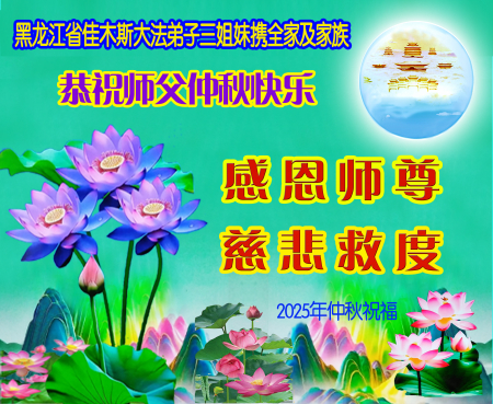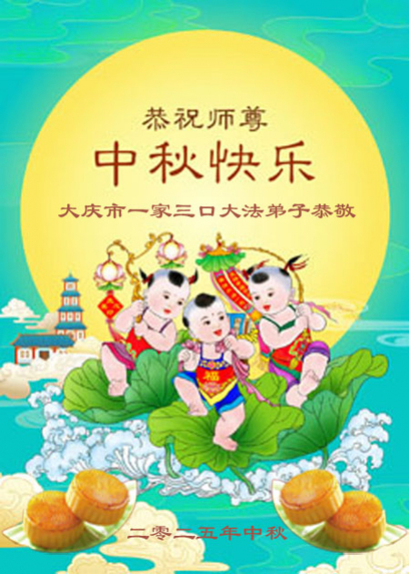 Một nhà ba đệ tử Đại Pháp tại khu Nhượng Hồ Lộ, thành phố Đại Khánh, tỉnh Hắc Long Giang kính chúc Sư tôn Tết Trung Thu vui vẻ!