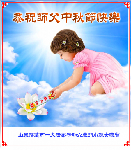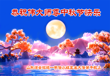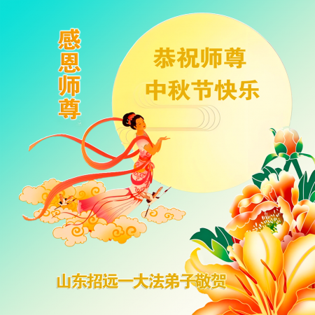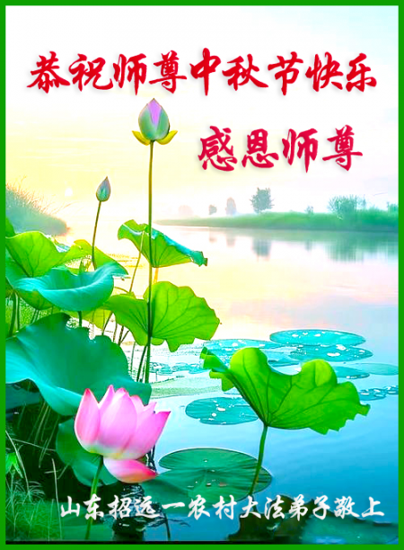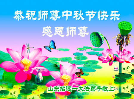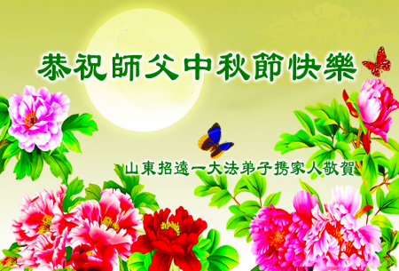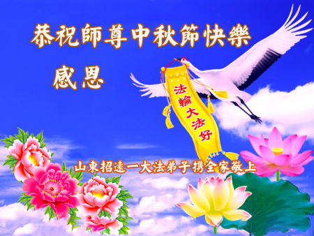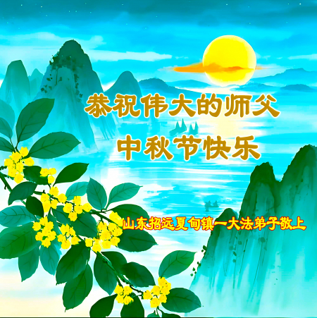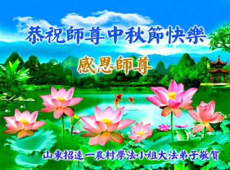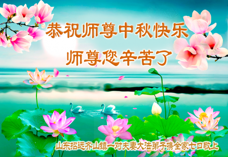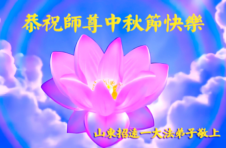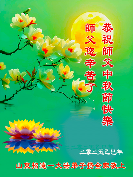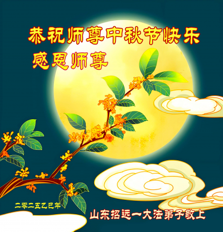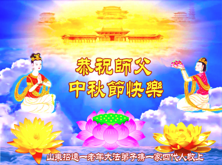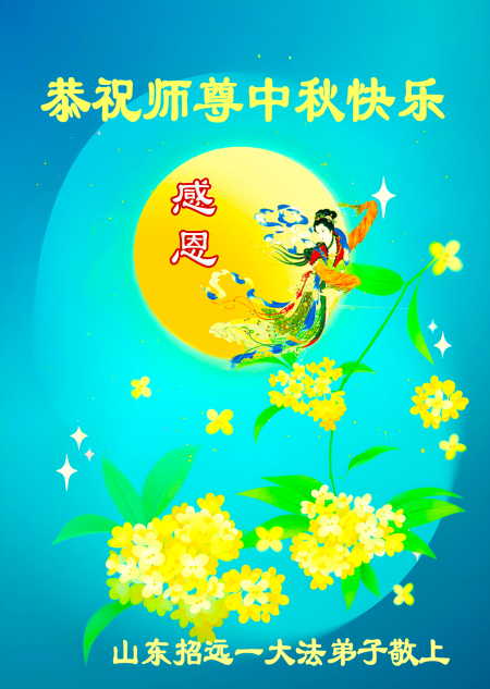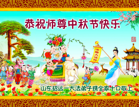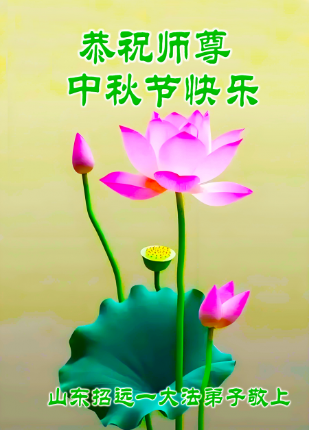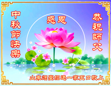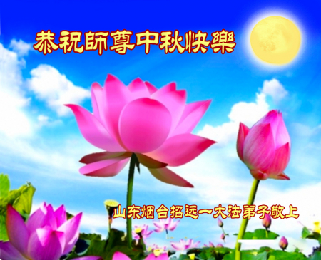 Mỗi độ đến ngày lễ tiết Trung Thu đoàn viên sum vầy, các đệ tử đều rất nhớ đến Sư tôn từ bi vĩ đại, chúng con mong ước được cùng Sư tôn đoàn tụ, chung vui ngày lễ ở Trung thổ! Tuy hiện nay chúng con và Sư tôn cách trở muôn dặm, nhưng chúng con biết rằng mọi thời khắc Sư tôn luôn luôn ở bên cạnh và bảo hộ cho chúng con. Chúng con tin tưởng rằng ngày đoàn viên với Sư tôn đang đến rất gần! Ánh sáng đang ở ngay trước mắt! Toàn thể đệ tử Chiêu Viễn, tỉnh Sơn Đông chúng con dưới sự dẫn dắt của Sư tôn, sẽ tinh tấn thực tu, nỗ lực làm tốt ba việc, học Pháp, đồng hóa với Pháp, tăng cường phát chính niệm, thanh trừ tà ác lạn quỷ, cứu người nhiều hơn, thực hiện lời thệ ước, nghênh đón Sư tôn về Trung Quốc, chúng con không muốn Sư tôn vì chúng con mà kéo dài thời gian kết thúc Chính Pháp và chịu đựng nhiều thống khổ. Cảm ân Sư tôn đã từ bi bảo hộ, chúng con quỳ bái Sư tôn, cung chúc Sư tôn Trung Thu vui vẻ!