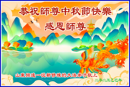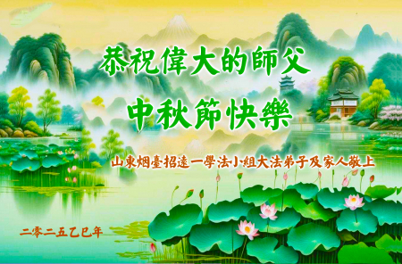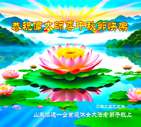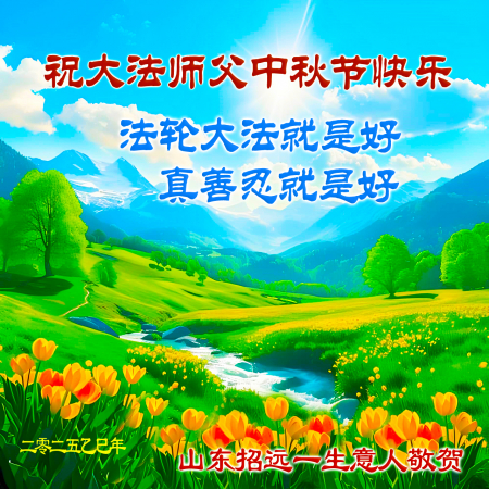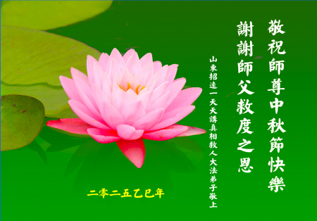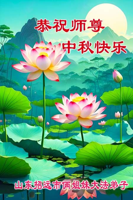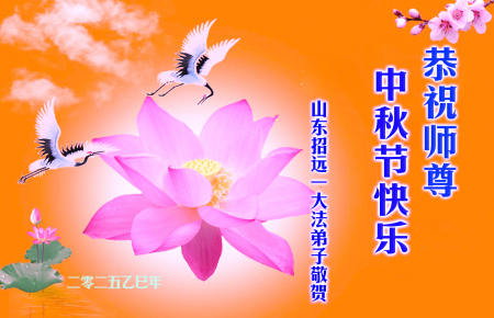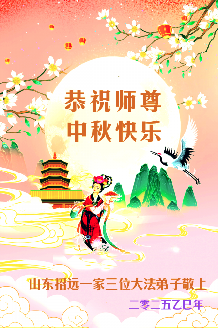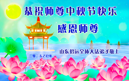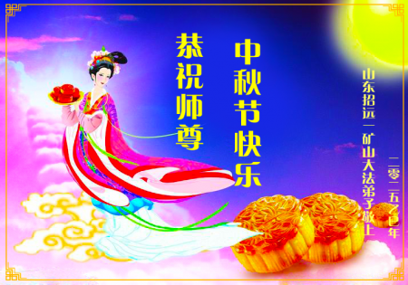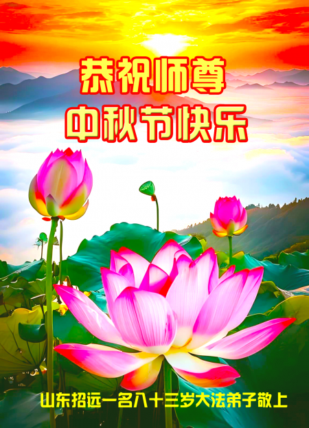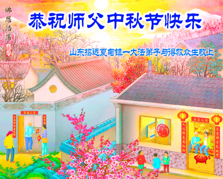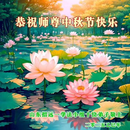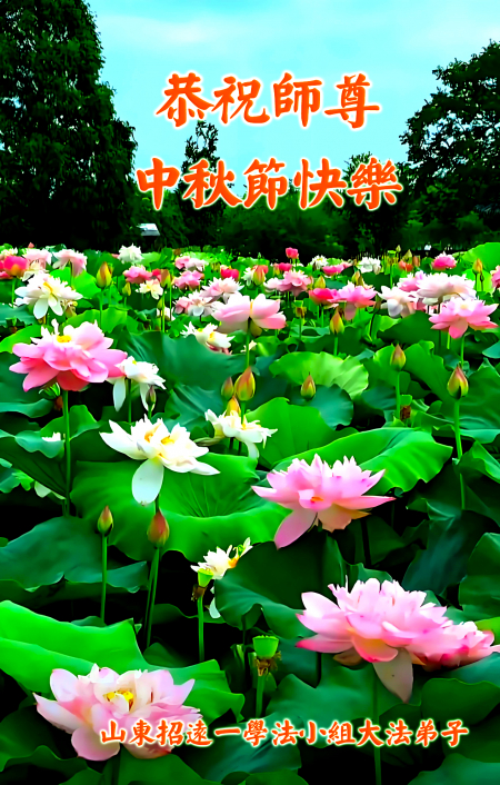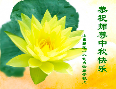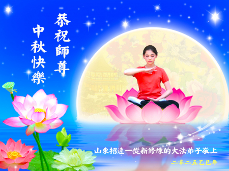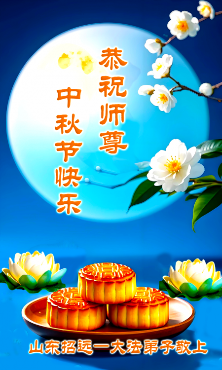 Mỗi độ đến ngày lễ tiết Trung Thu đoàn viên sum vầy, các đệ tử đều rất nhớ đến Sư tôn từ bi vĩ đại, chúng con mong ước được cùng Sư tôn đoàn tụ, chung vui ngày lễ ở Trung thổ! Tuy hiện nay chúng con và Sư tôn cách trở muôn dặm, nhưng chúng con biết rằng mọi thời khắc Sư tôn luôn luôn ở bên cạnh và bảo hộ cho chúng con. Chúng con tin tưởng rằng ngày đoàn viên với Sư tôn đang đến rất gần! Ánh sáng đang ở ngay trước mắt! Toàn thể đệ tử Chiêu Viễn, tỉnh Sơn Đông chúng con dưới sự dẫn dắt của Sư tôn, sẽ tinh tấn thực tu, nỗ lực làm tốt ba việc, học Pháp, đồng hóa với Pháp, tăng cường phát chính niệm, thanh trừ tà ác lạn quỷ, cứu người nhiều hơn, thực hiện lời thệ ước, nghênh đón Sư tôn về Trung Quốc, chúng con không muốn Sư tôn vì chúng con mà kéo dài thời gian kết thúc Chính Pháp và chịu đựng nhiều thống khổ. Cảm ân Sư tôn đã từ bi bảo hộ, chúng con quỳ bái Sư tôn, cung chúc Sư tôn Trung Thu vui vẻ!