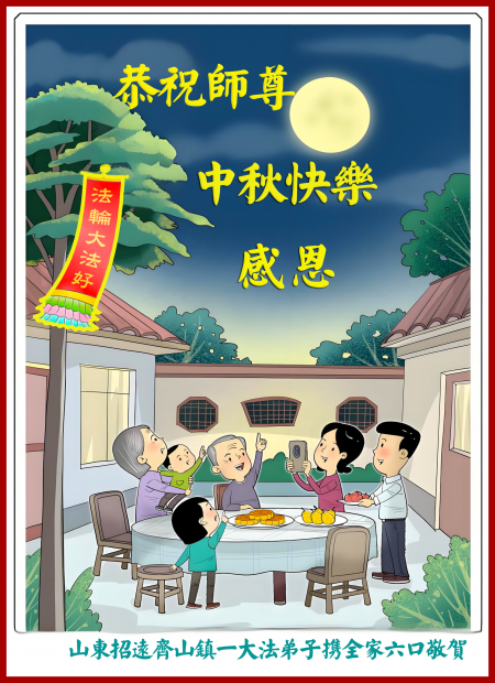 Một đệ tử Đại Pháp cùng toàn gia sáu người từ Chiêu Viễn, Yên Đài, tỉnh Sơn Đông kính chúc Sư phụ Trung Thu vui vẻ!