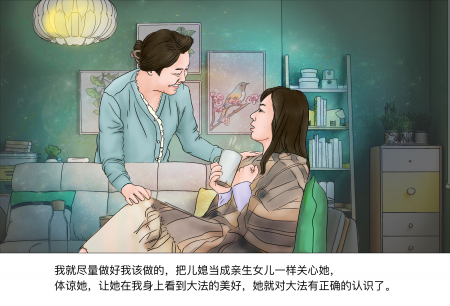 Tôi liền cố gắng làm tốt những gì mình cần làm, quan tâm tới con dâu như con ruột của mình, thấu hiểu con, để con dâu thấy được từ bản thân tôi vẻ đẹp của Đại Pháp, từ đó có được nhận thức đúng đắn về Đại Pháp.
