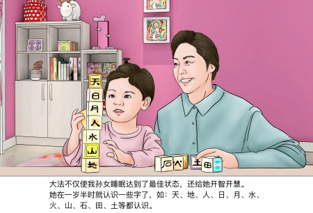 Đại Pháp không chỉ giúp cháu gái tôi có được trạng thái ngủ tốt nhất mà còn khai mở trí huệ cho cháu. Khi mới một tuổi rưỡi, cháu đã biết được nhiều chữ như: trời, đất, người, mặt trời, mặt trăng, nước, lửa, núi, đá, ruộng, đất (天、地、人、日、月、水、 火、山、石、田、土)…
