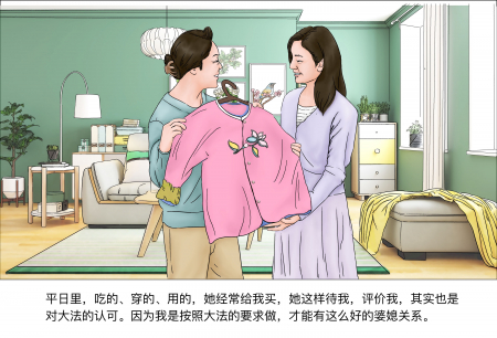 Thường thì chuyện ăn, mặc, đồ đạc hàng ngày là con dâu mua cho tôi. Cách đối đãi và cư xử này của con dâu kỳ thực cũng là sự công nhận đối với Đại Pháp. Chính vì tôi làm theo yêu cầu của Đại Pháp nên mới có được mối quan hệ mẹ chồng con dâu tốt đẹp như vậy.