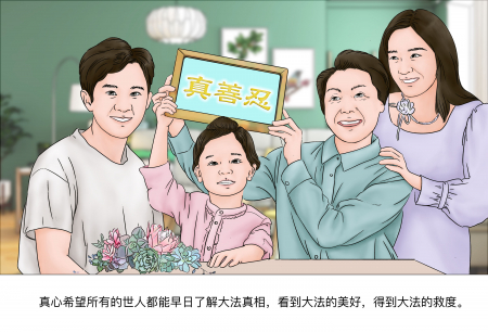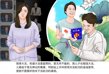 Tôi tu Đại Pháp, biết rằng Đại Pháp là siêu thường, không gì không làm được. Con trai tôi cũng tin vào Đại Pháp. Con dâu thì bị ảnh hưởng bởi thuyết vô thần, thêm vào những lời vu khống của tà đảng Trung Cộng đối với Pháp Luân Công, nên không muốn nghe chân tướng.
