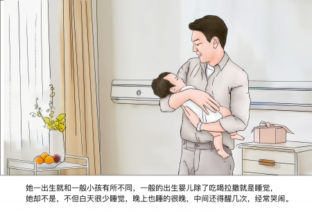 Ngay từ khi chào đời, cháu đã khác những đứa trẻ bình thường. Thông thường trẻ sơ sinh ngoài việc uống sữa, đi vệ sinh ra thì chỉ ngủ, nhưng cháu thì không. Ban ngày cháu không chỉ rất ít ngủ, mà đến tối cũng ngủ rất trễ, giữa đêm còn thường xuyên thức giấc vài lần, quấy khóc không chịu yên.