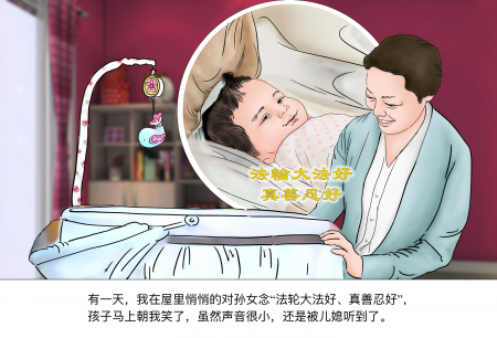 Một ngày nọ, tôi ở trong phòng thì thầm vào tai cháu gái “Pháp Luân Đại Pháp hảo, Chân Thiện Nhẫn hảo”. Cháu gái lập tức mỉm cười với tôi, mặc dù tôi nói rất nhỏ nhưng vẫn bị con dâu nghe thấy.