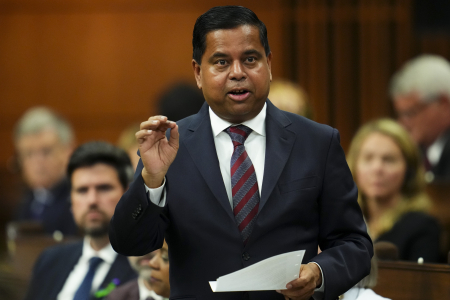 Bộ trưởng An ninh Canada Gary Anandasangaree đã gửi thư cho Hiệp hội Pháp Luân Đại Pháp để trả lời các câu hỏi về cuộc đàn áp xuyên quốc gia của ĐCSTQ. Ảnh chụp Bộ trưởng Anandasangaree trả lời các câu hỏi trong phiên chất vấn tại Hạ viện trên Đồi Quốc hội ở Ottawa vào ngày 03/06/2025. (Ảnh: Sean Kilpatrick/The Canadian Press)