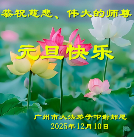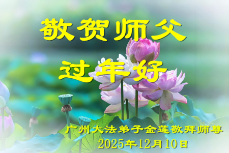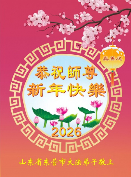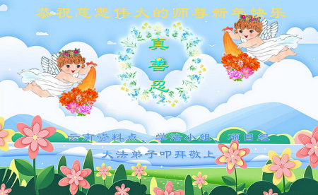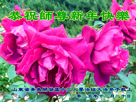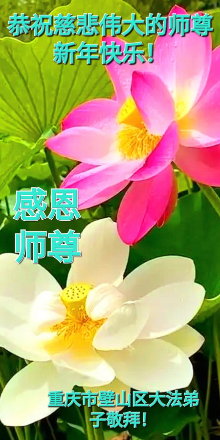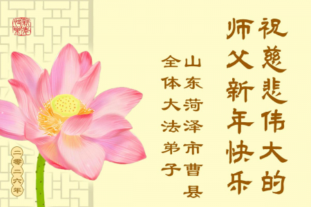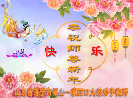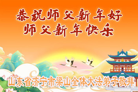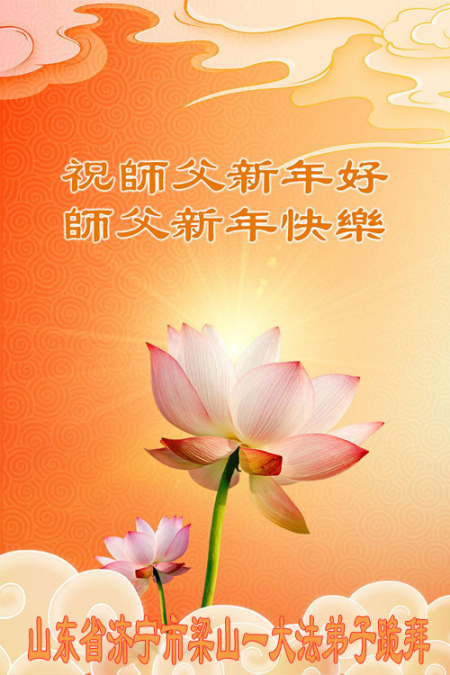 Chúng con là các đệ tử Đại Pháp tại Lương Sơn, Sơn Đông, trước tiên xin kính chúc năm mới Sư phụ! Cung kính hợp thập trước Sư tôn! Quỳ bái Sư tôn! Từ phương xa kính chúc Sư tôn năm mới vui vẻ! Cảm ân Sư Tôn từ bi khổ độ! Đệ tử dù dùng hết mọi ngôn ngữ của nhân loại cũng không thể diễn tả hết lòng biết ơn đối với Sư tôn! Đệ tử nhất định theo sát Sư phụ, kiên định tu luyện đến cùng, bước cho đúng, bước cho chính đoạn đường tu luyện cuối cùng mà Sư phụ đã an bài. Trong quãng thời gian còn lại không nhiều này, sẽ học Pháp nhiều hơn, tu tốt bản thân, cứu độ thêm nhiều người, hoàn thành đại nguyện tiền sử khi đến thế gian! Theo Sư phụ trở về nhà! Xin cảm tạ Sư tôn! Xin cảm tạ Sư tôn! Xin cảm tạ Sư tôn!