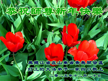 Một gia đình bốn người là đệ tử Đại Pháp quê tại Hắc Long Giang, đang làm việc tại Khu khai phát Thanh Đảo, tỉnh Sơn Đông kính chúc Sư tôn năm mới vui vẻ!