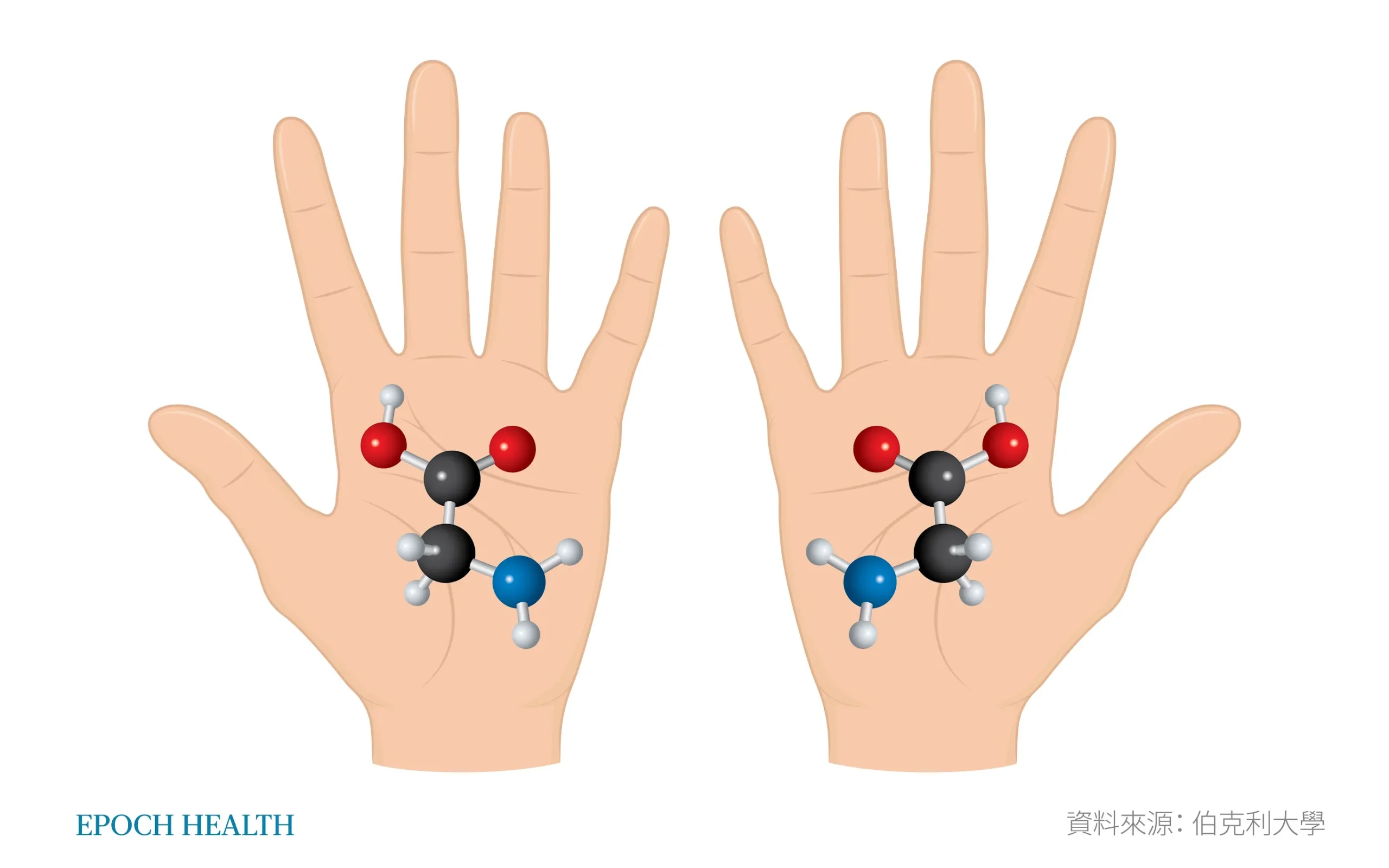 Các phân tử trong thế giới sinh vật giống như tay trái và tay phải của con người, chúng có vẻ giống nhau, nhưng cấu trúc ba chiều lại không thể trùng hợp. (Ảnh: The Epoch Times)