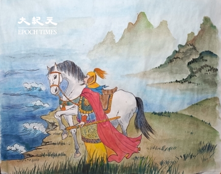 Nhạc Phi dắt ngựa đến bên sông. (Thanh Ngọc vẽ /The Epoch Times)