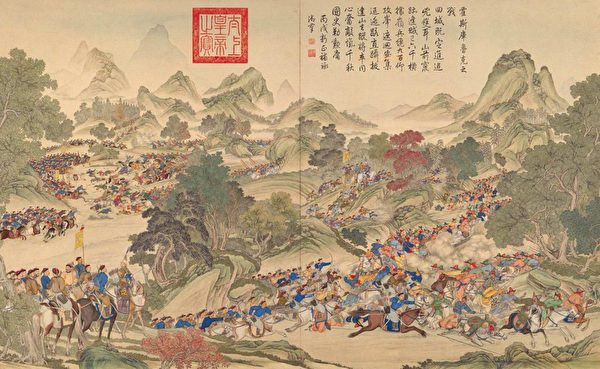 Trong trận đại chiến Yển Thành, Nhạc gia quân đã chiến đấu hết sức. Trong hình là bức “Trận chiến Hoắc Tư Khố Lỗ Khắc” trong bộ tranh “Bình định Chuẩn bộ Hồi bộ đắc thắng đồ”, do Lang Thế Ninh và những người khác vẽ. (Ảnh thuộc sở hữu cộng đồng)