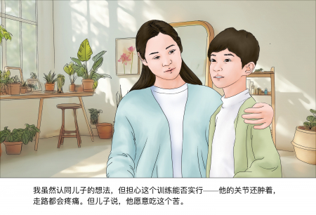 Mặc dù đồng ý với quyết định của con, nhưng tôi vẫn lo lắng việc tập luyện như vậy con có làm được không. Các khớp xương của Tiểu Minh vẫn còn sưng, đi lại vẫn đau đớn. Nhưng Tiểu Minh nói rằng cháu sẵn lòng chịu khổ.