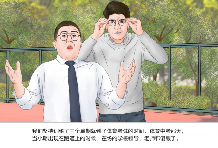 Chúng tôi kiên trì tập luyện được ba tuần thì đến ngày diễn ra buổi thi thể dục. Vào ngày thi, khi Tiểu Minh xuất hiện trên đường chạy, ban giám hiệu và thầy cô có mặt đều kinh ngạc.