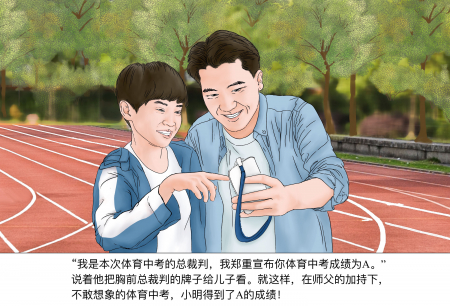 Tôi là trọng tài chính của kỳ thi thể dục lần này, tôi trịnh trọng tuyên bố trong kỳ thi lần này, em đạt được điểm A. Vừa nói ông vừa chỉ tấm thẻ trọng tài chính trên ngực áo cho cháu xem. Cứ như vậy, dưới sự gia trì của Sư phụ, trong kỳ thi thể dục tưởng như không thể vượt qua ấy, Tiểu Minh đã đạt được điểm A!