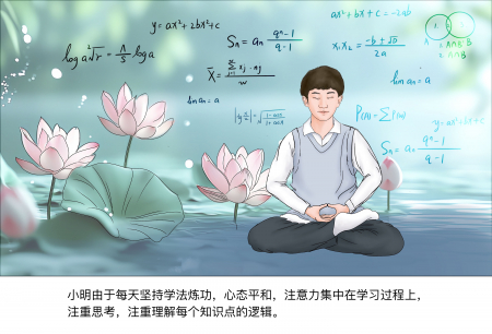 Nhờ mỗi ngày đều kiên trì học Pháp và luyện công, tâm thái của Tiểu Minh luôn bình hòa, tập trung vào quá trình học tập, cháu coi trọng suy xét và nắm chắc logic của từng điểm kiến thức.