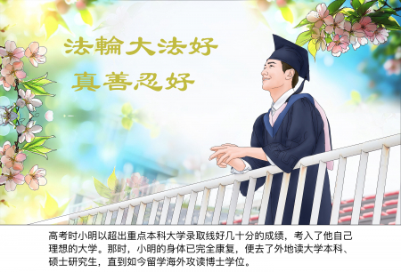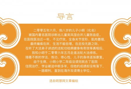 Tháng 06 năm 2005, con trai Tiểu Minh (hóa danh) tám tuổi của tôi được một bệnh viện nổi tiếng trong nước chẩn đoán mắc bệnh viêm khớp dạng thấp kèm nhiễm trùng huyết ở trẻ em. Sau khi điều trị tại bệnh viện gần một năm nhưng không hiệu quả, khớp xương toàn thân của cháu bị biến dạng, các bắp thịt bị teo lại, sau cùng cháu đã bị liệt phải nằm một chỗ, không thể tự sinh hoạt hàng ngày được. Giữa lúc cùng đường tuyệt vọng, sau khi được các học viên Đại Pháp nói về hiệu quả kỳ diệu của Pháp Luân Công trong việc chữa bệnh khỏe người, tới tháng 05 năm 2006 tôi và Tiểu Minh đã bước vào tu luyện Pháp Luân Đại Pháp. Nhờ không ngừng học Pháp, luyện công, tu tâm tính, thân thể con tôi đã dần dần hồi phục. Vì bị bệnh, Tiểu Minh chưa học xong lớp hai tiểu học đã phải nhập viện điều trị, việc học bị gián đoạn suốt nhiều năm, thế nhưng thành tích của cháu lại không hề thua kém mà luôn luôn thuận lợi cho đến khi cháu ra nước ngoài học tiến sĩ.