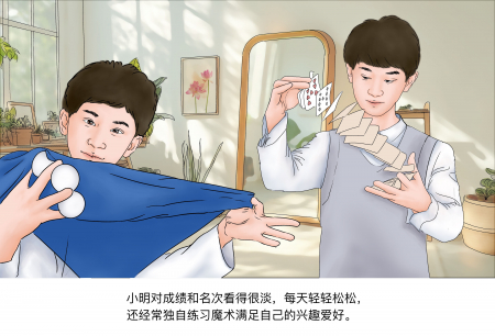 Tiểu Minh không quan tâm tới thành tích hay thứ hạng, mỗi ngày đều nhẹ nhàng thoải mái, lại còn thường xuyên tự luyện tập các trò ảo thuật để thỏa mãn sở thích của mình.