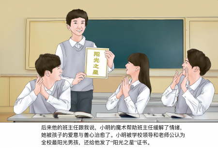 Về sau, cô chủ nhiệm lớp đã nói với tôi rằng, màn ảo thuật của Tiểu Minh đã giúp cô giải tỏa căng thẳng, cô đã được tình yêu thương và sự lương thiện ấm áp của cháu chữa lành. Tiểu Minh được ban giám hiệu trường và các giáo viên công nhận là nam sinh tỏa sáng nhất trường, còn được trao chứng nhận “Ngôi sao Ánh Dương”.