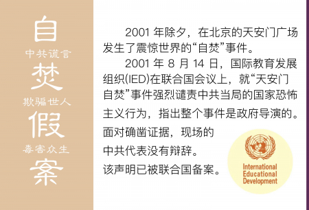 Đêm giao thừa năm 2001, một vụ tự thiêu chấn động thế giới đã xảy ra tại Quảng trường Thiên An Môn, Bắc Kinh. Ngày 14/08/2001, Tổ chức Phát triển Giáo dục Quốc tế (IED) tại một cuộc họp Liên Hợp Quốc đã lên án mạnh mẽ hành động của ĐCSTQ là khủng bố nhà nước, chỉ ra toàn bộ vụ việc đều do chính quyền dàn dựng. Trước những bằng chứng không thể chối cãi, đại diện ĐCSTQ có mặt tại đó đã không đưa ra được bất kỳ lời biện hộ nào.