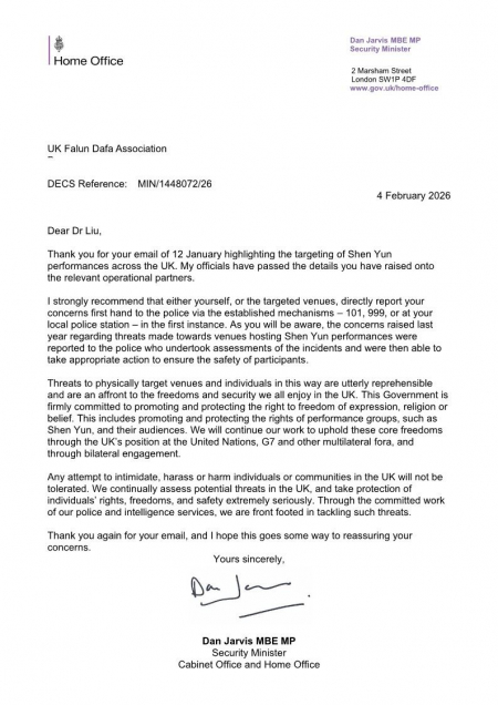 Hôm 4/2/2026, Bộ trưởng An ninh Anh quốc, ông Dan Jarvis, đã gửi thư đến Hiệp hội Pháp Luân Đại Pháp Anh để lên án hành vi đe dọa và tấn công cá nhân nhằm vào các nhà hát và nghệ sĩ của Đoàn Nghệ thuật Biểu diễn Shen Yun. Ông cho rằng những hành vi này là “vô cùng nghiêm trọng” và là sự ngang nhiên xâm phạm vào tự do và an ninh chung mà xã hội nước Anh đang được hưởng.