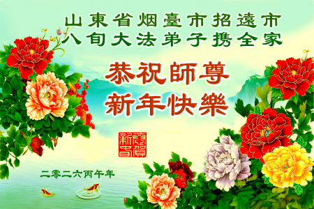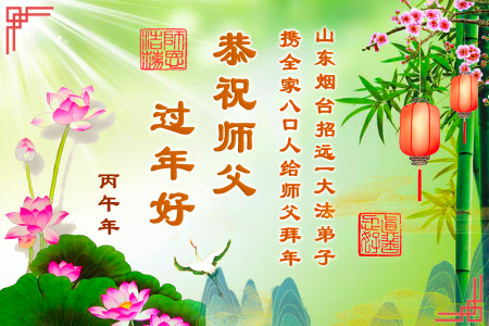 Một đệ tử Đại Pháp tại Chiêu Viễn, Yên Đài, Sơn Đông cùng cả gia đình tám người gửi lời chúc mừng năm mới đến Sư phụ! Kính chúc Sư phụ năm mới vui vẻ!