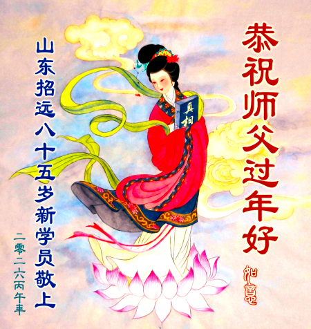 Một đệ tử Đại Pháp 93 tuổi mới đắc Pháp tại Chiêu Viễn, Yên Đài, Sơn Đông chúc Tết Sư phụ!