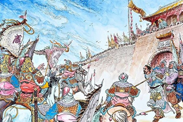 Đường Thái Tông trói Đậu Kiến Đức giải đến chân thành Đông Đô Lạc Dương, Vương Thế Sung nhìn thấy Đậu Kiến Đức bị bắt lập tức dẫn các quan binh ra xin hàng. (Tranh: Tào Túy Mộng/The Epoch Times)