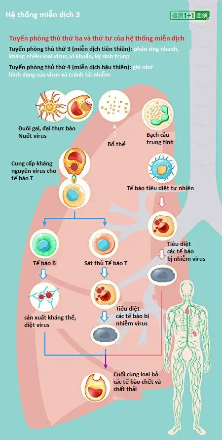 Lúc này cơ thể có một hệ thống miễn dịch tinh vi hơn để đối kháng. Nó được chia thành hệ thống miễn dịch tiên thiên và hệ thống miễn dịch hậu thiên, tương ứng với tuyến phòng thủ thứ ba và thứ tư của cơ thể con người. Các tế bào miễn dịch khác nhau trong hệ thống miễn dịch này đều có vai trò và kỹ năng đặc biệt khác nhau. Chúng chiến đấu chống lại những kẻ xâm lược, phát động các cuộc tấn công để cố gắng loại bỏ virus và vi khuẩn.