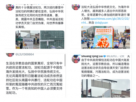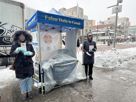 Trong hai ngày 22/02 đến 23/02, một trận bão tuyết siêu mạnh đã tấn công thành phố New York, tuyết rơi mù mịt, phủ dày trên mặt đất, gió rét lạnh buốt, nhiệt độ xuống dưới 0°C. Thị trưởng New York phát lệnh cấm giao thông, ngay cả các siêu thị Trung Quốc ở Flushing vốn mở cửa quanh năm không nghỉ cũng phải phá lệ tạm ngừng kinh doanh. Thế nhưng các điểm giảng chân tướng của Pháp Luân Công vẫn mở đúng giờ tại phố Main (Main St.) ở Flushing, khiến người Hoa đi ngang qua không khỏi sinh lòng kính phục.